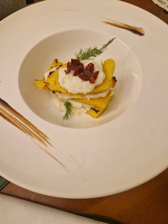 Polenta alla brace con baccalà mantecato e pomodori secchi