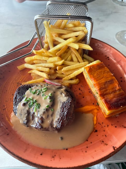 7.5/10Shown to a seat with a lovely view in the large terrace. Service was good to start but then became slow as the afternoon progressed-as if the servers wanted to go home. Food was good-veal for me and cod for my dad. Large portions. With a bottle of wine, coffee and one dessert bill was around £55.