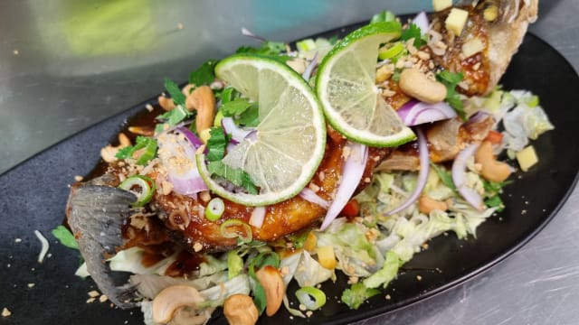 herbes thai épicé et aromatique, recette originale du nord-est de Thailande - Spicy thai salmon tartare with herbs, traditional recipe from Northeastern Thailand