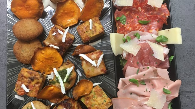 - Mix de charcuterie, légumes grillés, fromage, tomates cerises, artichauts et parmesan.