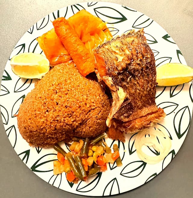 Riz mijoté dans sa sauce tomate accompagné de ses délicieux légumes avec du poisson