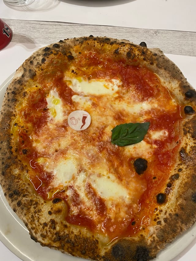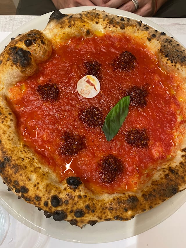 Impasto speciale o’ cuorn (leggermente piccante), provola affumicata, cherry gialli, olive taggiasche, scarola con peperoncino e pinoli