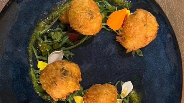 Beignets de poisson ou crevettes en fonction de l'inspiration de la cheffe, salade de pickles, sauce chien