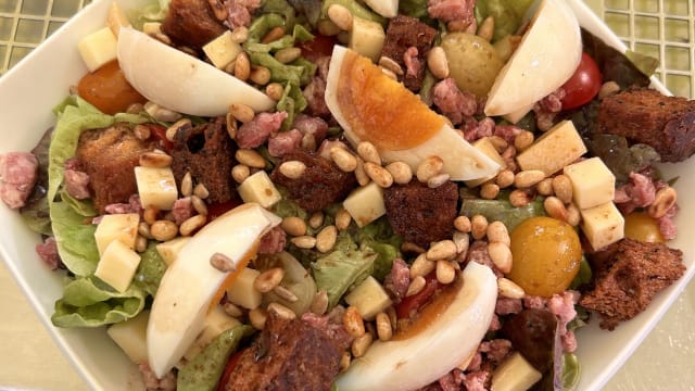 - Pain artisanal, steak haché, confit d'oignons, sauce maison, frites et salade