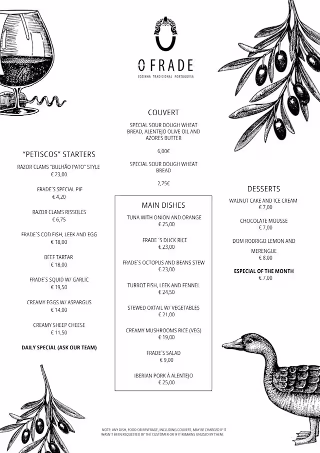 9.5/10One of my perennial favorites, O Frade never disappoints and I love introducing it to friends who have never been. This evening the standout was the Cataplana, but the lingueirão are also always delicious. We shared the Turbot accented with leeks and fennel, and finished with the sublime walnut cake - Can’t wait to return next month.