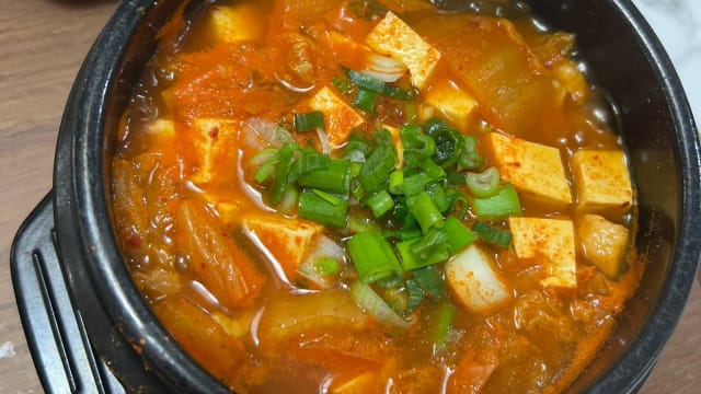 Trois raviolis grillés + dolsot bibimbap (mélange de riz avec des légumes) et viande au choix ( bœuf, porc, poulet, saumon ou végétarien) et banchan