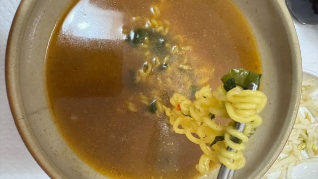 Trois raviolis grillés + ramen (nouilles épicées), kimbap (5 pièces) et banchan