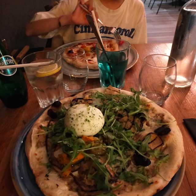 - Margherita, salami piquant, oignons rouges, roquette, pecorino