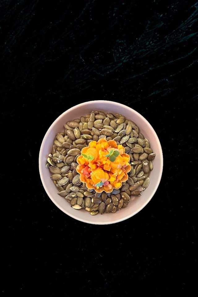 - Espargos verdes, carapau marinado em soja, laranja do algarve, sabayón de alga nori