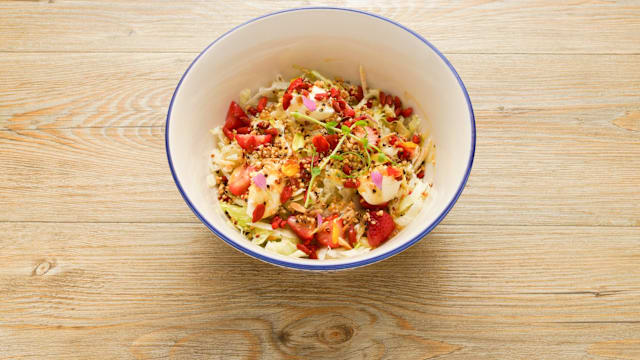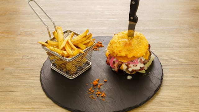 Acompanha ovo estrelado, arroz, batata frita e salada
