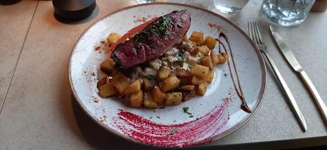 - (Cooked at low temperature and finished in a pan) - Potato Purée, Creamy Mushroom Sauce