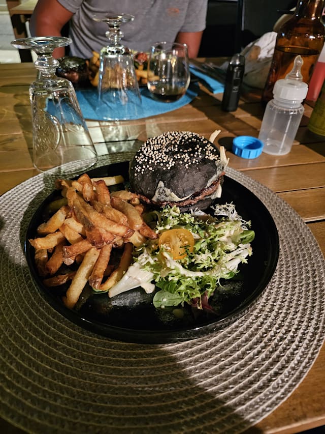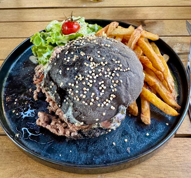 Pain brioché noir, steak haché ( 150 gr ), sauce bbq white maison, lard grillé, comté AOP, frites maison
