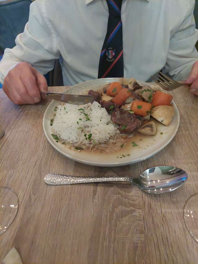Plat emblématique de la cuisine française, préparé avec du bœuf mijoté plusieurs heures, parfumé d'ail et d'herbes aromatiques. Accompagné de champignons et de petits oignons glacés.