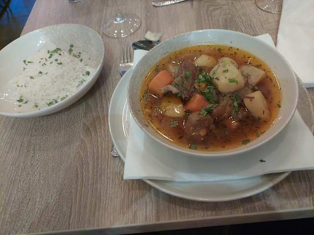 Mijoté lentement avec une garniture de légumes de saison (navets, carottes, pommes de terre). Sauce légèrement tomatée et parfumée au thym.