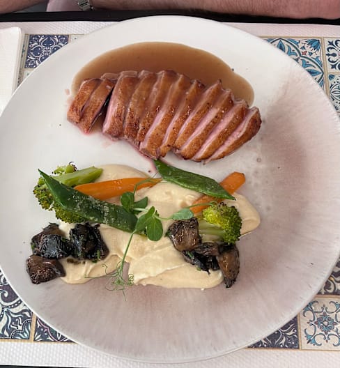7.5/10brilliant welcome by the staff and a great bottle of wine with the meal. the server recommended the clams that were just in and they were very tasty. I thought that was a great start. I had the duck and my wife had the beef rib. The duck was not cooked enough for me the fat had no colour or crisp to it and I found everything on the plate under seasoned. The beef rib was lovely but the accompaniments were underwhelming and under seasoned maybe a rich sauce or something with the beef would have been better.