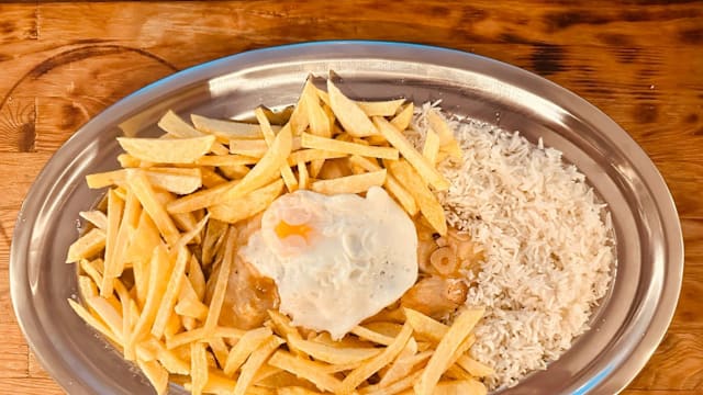 Acompanha batata frita às rodelas, presunto e ovo estrelado