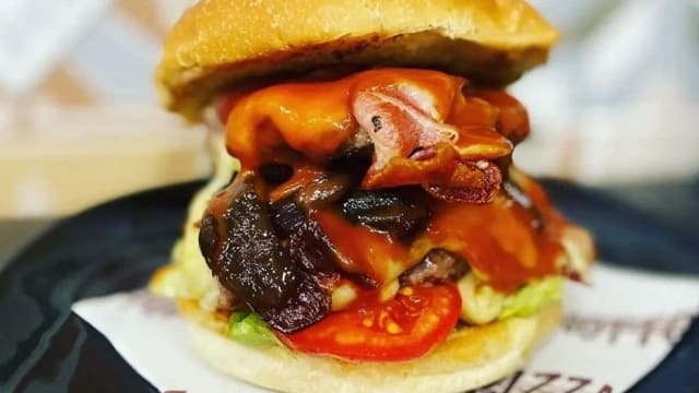 Hamburger di scottona, crema di parmigiana di melanzana , provola , cialda di formaggio