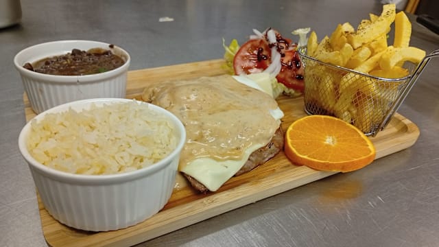 Secretos, camarão, batata frita, arroz, feijão preto e abacaxi
