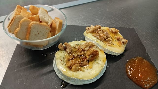 Camembert gratinado c/mel doce de abóbora e nozes
