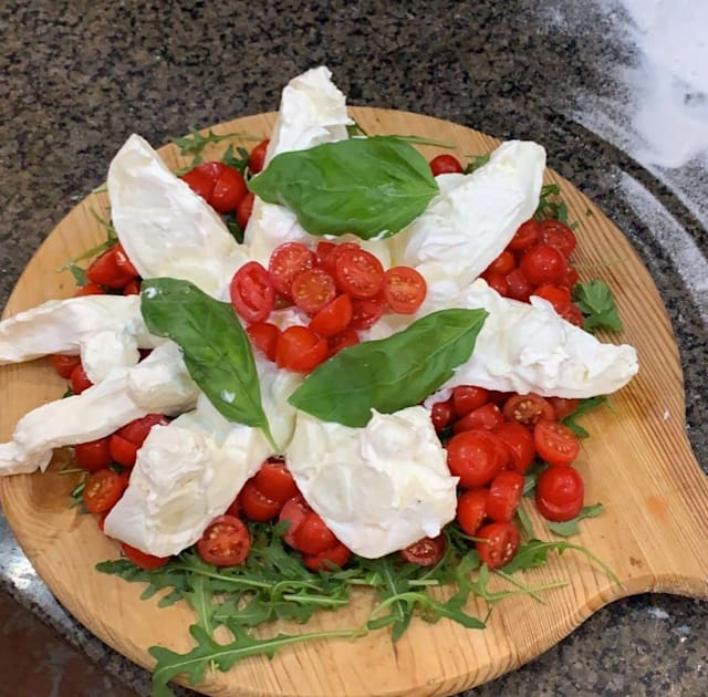- Mozzarella, pomodoro delpiennolo, pomodoro datterino giallo, pomodorino ciliegino, pomodoro san marzana, ricotta salata olio, grana e basilico