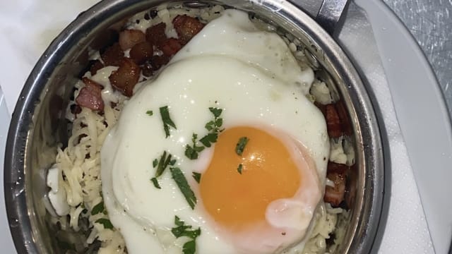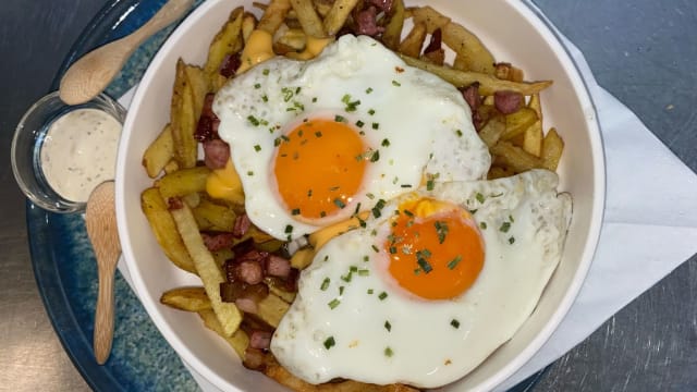 Batata frita caseira, queijo mussarela, bacon frito, cebolinha e dois ovos.
