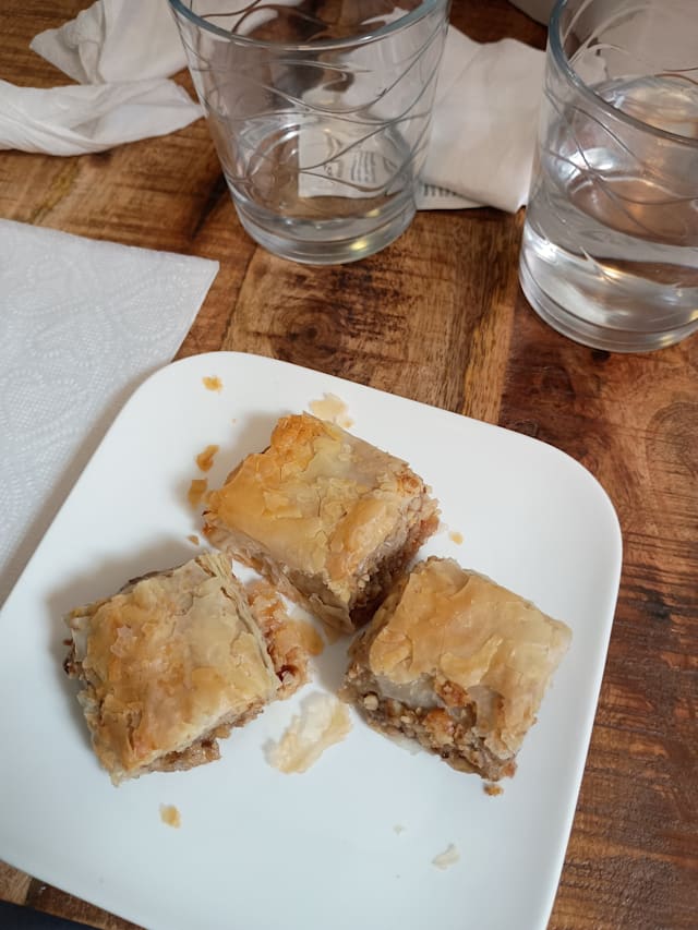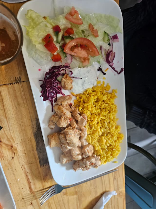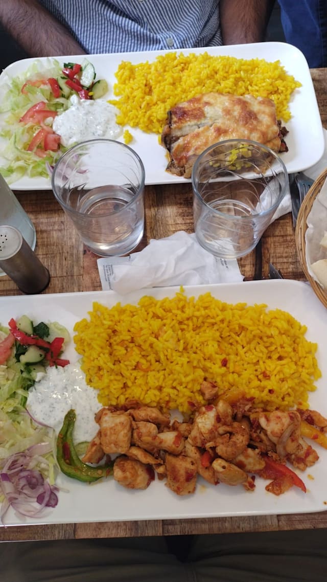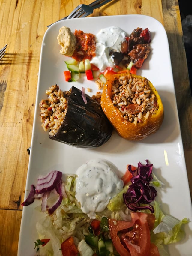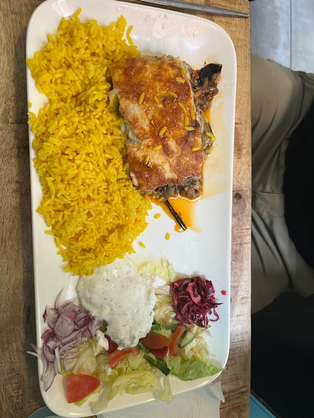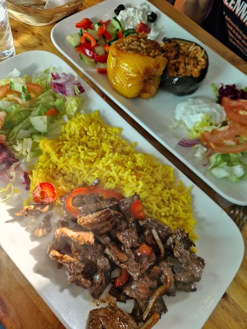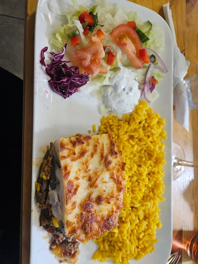 8.5/10Armenian Kilikia beer. Greek salad. moussaka with yellow rice. Armenian red wine. Buttery baklava dessert.