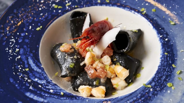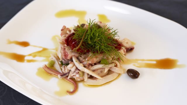 4 spiedini: 2 spiedini di gamberi e 2 spiedini di calamari con pane profumato.