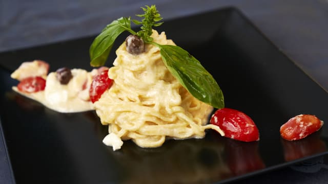 Spaghetti con uovo, pecorino romano, guanciale, pepe.