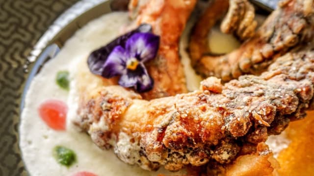 - Calamari e gamberi fritti accompagnati da verdure croccanti.
