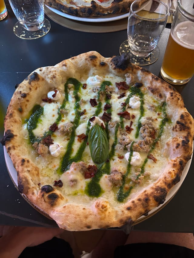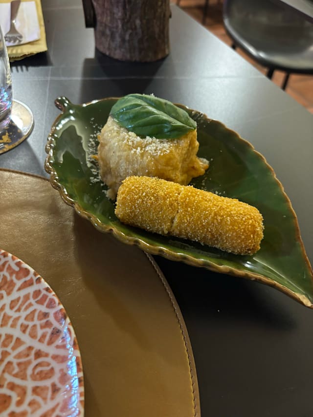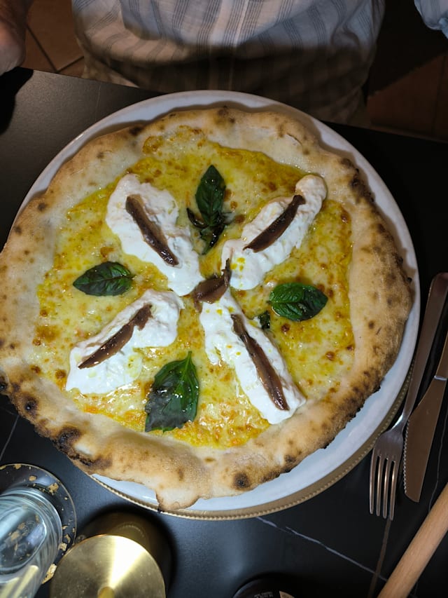 Crema di datterino giallo, pesto di aglio orsino, alici di cetara, origano del monte saro, pacchetella del piennolo del vesuvio DOP, terra di olive, mousse di grana padano DOP, basilico, olio evo DOP.