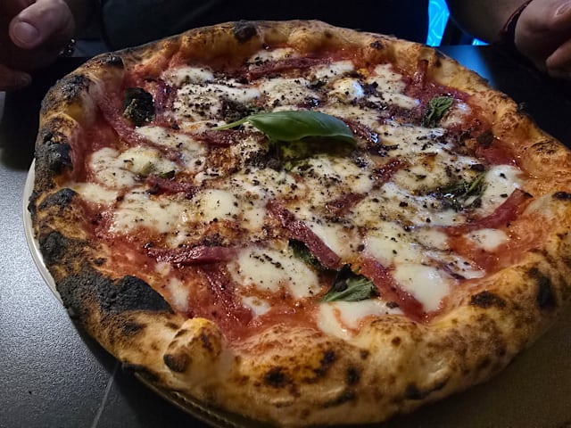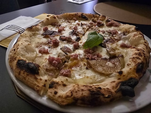 Scarola condita con capperi e olive nere, provola, salsiccia di bra, in uscita colatura di alici.