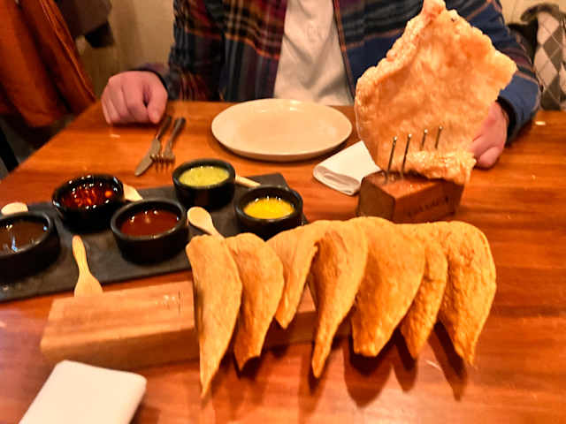 - ... with totopos (tortilla chips), chicharrón (pork crackling), and our five sauces of the day: