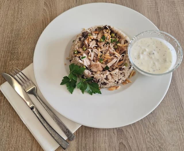 - Trois couches pain croustillant, pois chiches et sauce yaourt, garniture pignons de pins frits