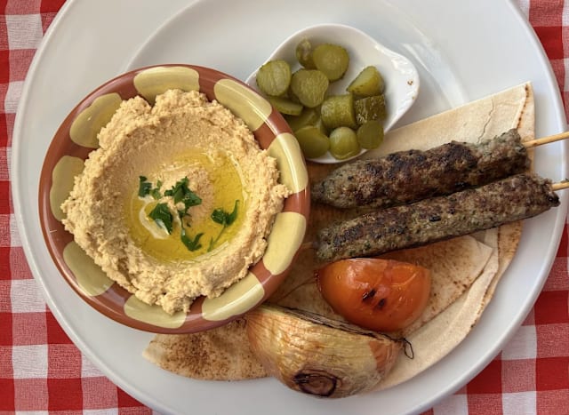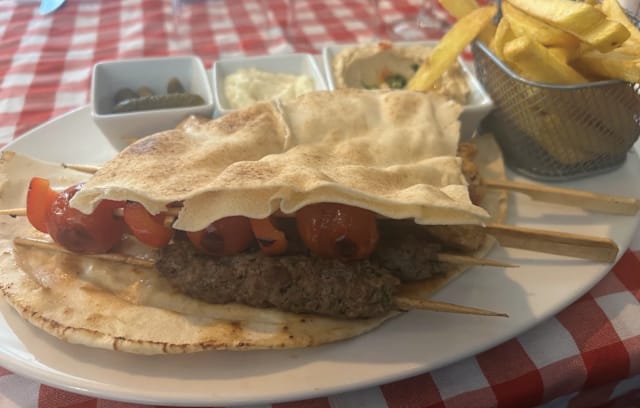 - Brochettes de kofta, servies avec du houmous, des cornichons, et des frites ou de la salade maison