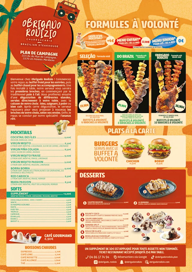 À la carte, une variété de viandes cuites à la broches, des formules midi et soir, des formules enfants, des cocktails sans alcool, des desserts, un buffet ...
