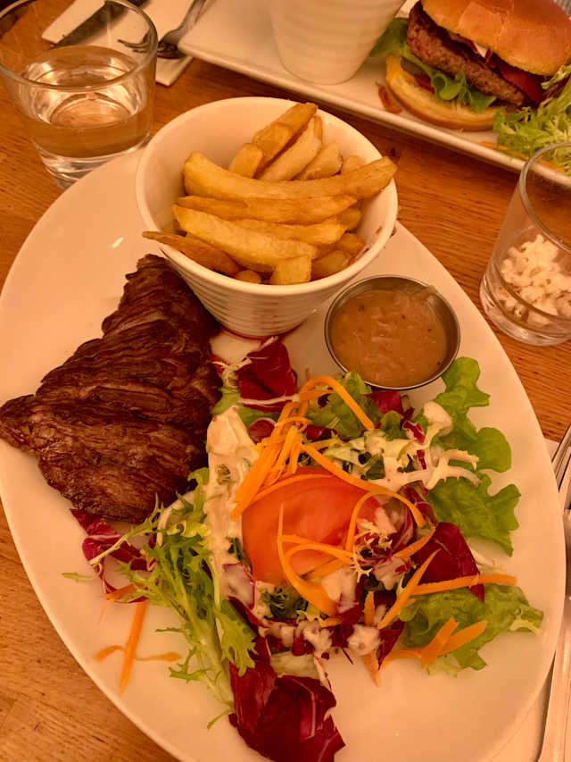 - Sauce poivre, béarnaise où bleu, frites et mesclun