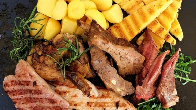 Grigliatona di Ribs (1/4 di baffa), Salamella mantovana, Tagliata di Scottona, Sovracoscia di pollo, Patate con la buccia e Chips di Polenta
