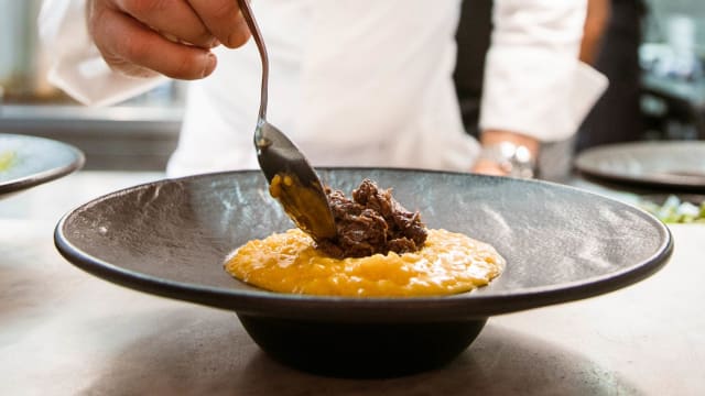 Risotto allo zafferano, ossobuco sfilacciato, limone