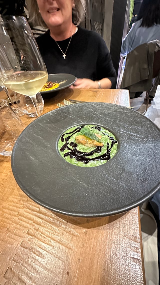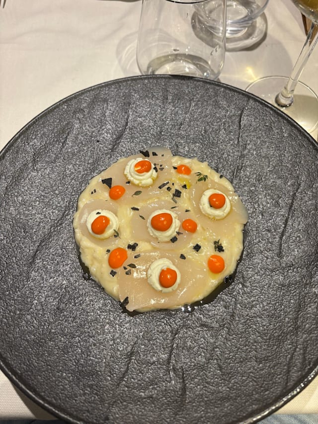 Risotto al timo limone con carpaccio di capesante, caprino, emulsione di peperoncino, sale di cipro