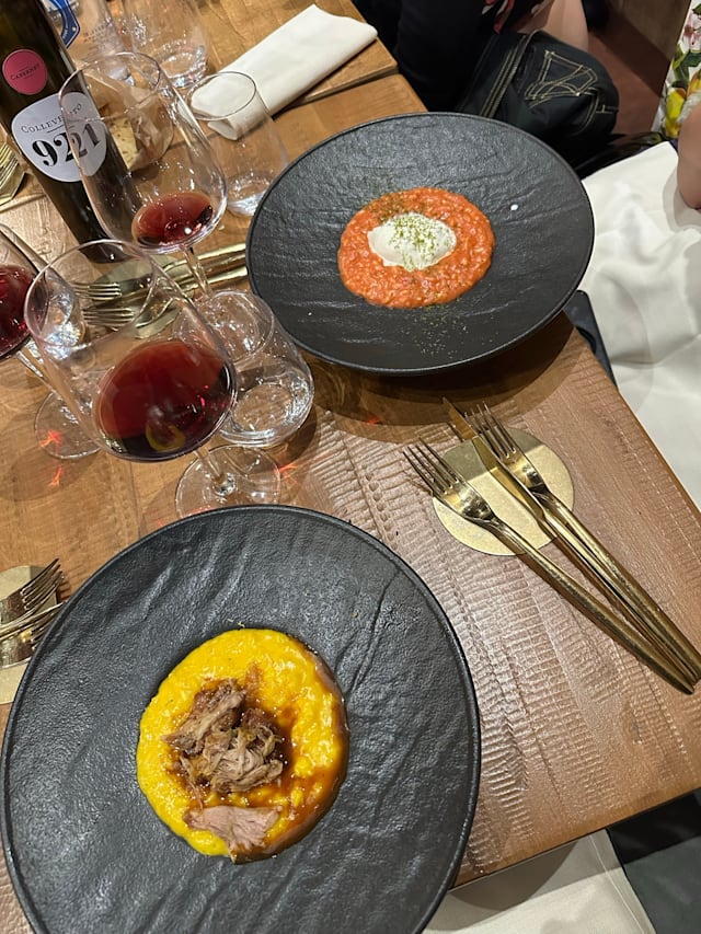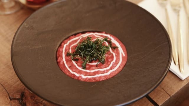 Risotto alla barbabietola, crema di pecorino, rucola fritta