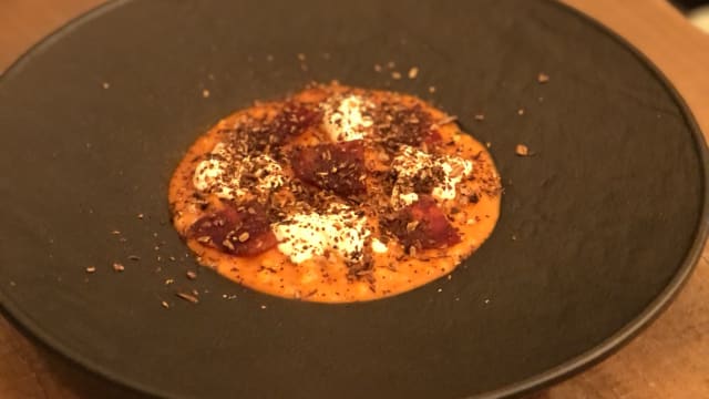 Risotto con topinambur, mele renette, lardo, midollo, fondo balsamico di sedano rapa e cipolla bruciata