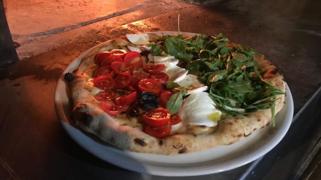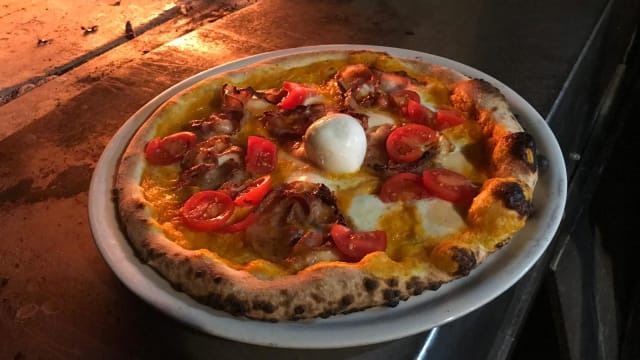 Mozzarella, pomodorini, salsiccia, porcini, grana