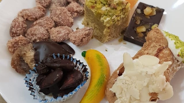 Scegli la granella tra: - scaglie di ciccolato - granella di pistacchio - granella di mandorle - arancia candita