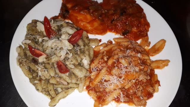 Pomodoro, verdure della casa, capuliato (pomodori secchi), mandorle, olio e origano