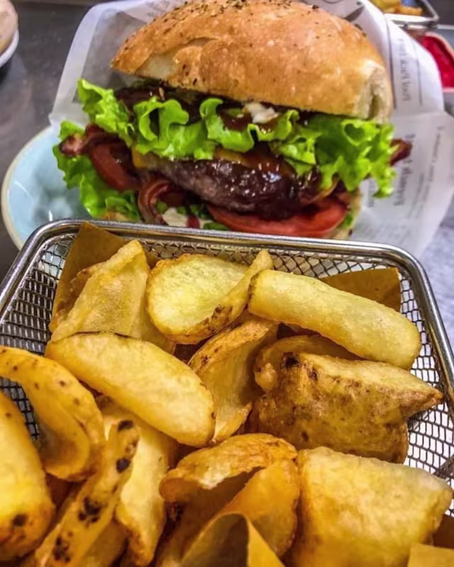 - Hamburger d'angus 200g con scamorza, bacon, verdure grigliate, cipolla caramellata e patatine fritte