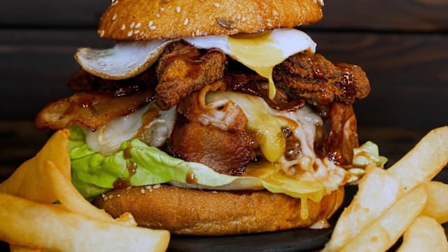 Pan brioche artigianale, burger da 220gr. di bovino nostrano, chips di sedano rapa croccante, fonduta di parmigiano, uovo al paletto, amis bacon, lattuga