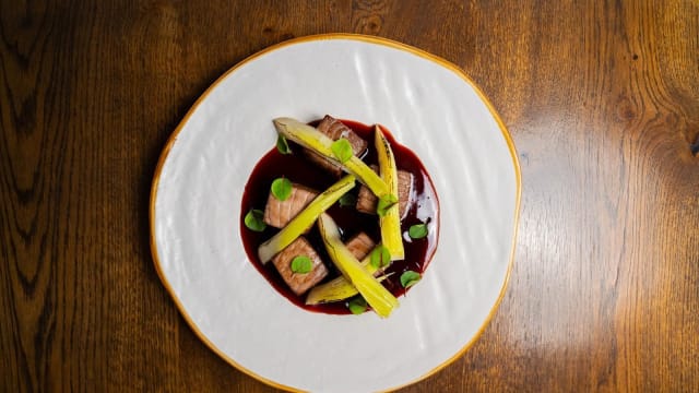 Salsa barbecue, spuma di patate, taccole, melanzana arrosto