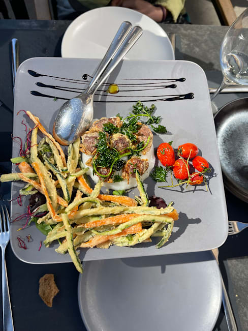 9.5/10Firstly we were running late for our booking and our hotel rang up and they were ok to hold the booking. We arrived 20 mins late and sat down to a refreshing Spritz ! The dishes we ordered was delicious and seafood so fresh and pasta was definitely home made. The summer salad was generous in size and lots of fresh prawns and summer fruits the mango n avocado was very good. We ordered cappuccino and it came with some biscuits .. service was also very good. It was a very good meal and highly recommended .