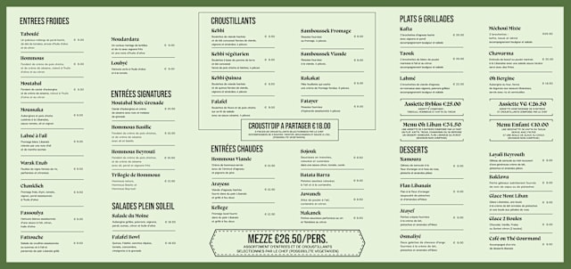 10/10The menu Habibi is very good and strong. This is a good deal for quantity and quality. Very good ambiance and the restaurant is very clean. The price of Lebanon beer seems to me very expensive, small size for 7.5 euros !