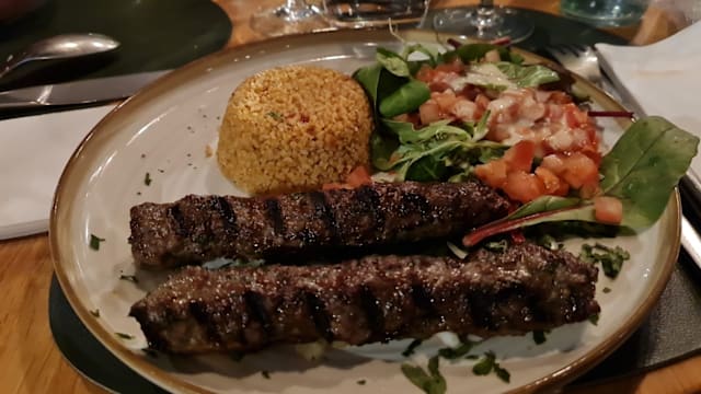 2 Brochettes d'agneau haché avec oignons et persil accompagnement boulgour et salade